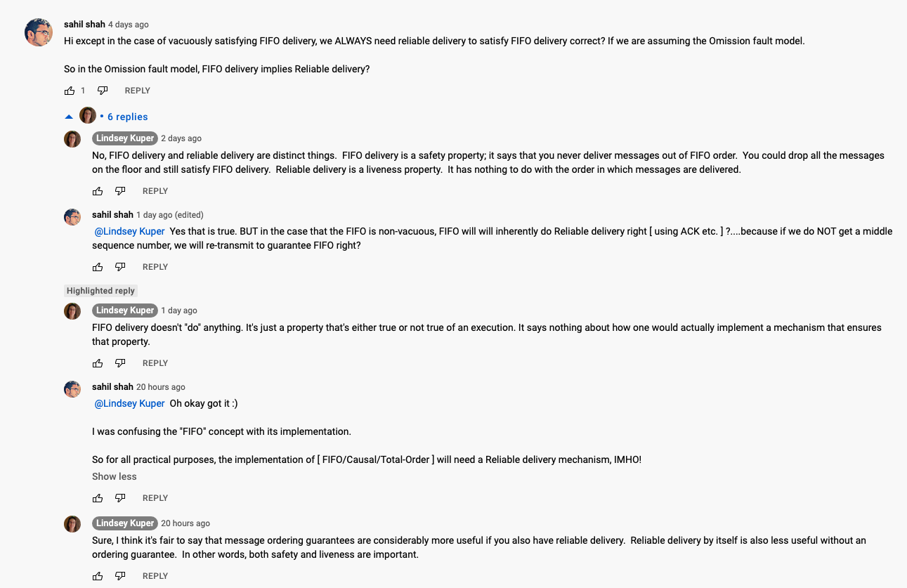 TCP provides FIFO delivery + Reliable delivery. However, we can have Reliable delivery without it being FIFO/Causal/Total-Order etc. But does the FIFO/Causal/TO orderings imply that the underlying network is Reliable? Not-really as explained below!