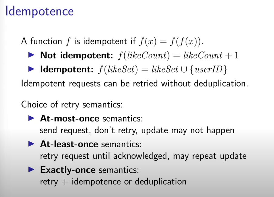 Most Distributed Systems work under the assumption that there will be Omission Faults [ We will talk about Byzantine faults later ]. Now under the Omission Faults model, the fundamental solution is to re-transmit messages. Therefore we need to consider the side-effects of these re-transmissions.